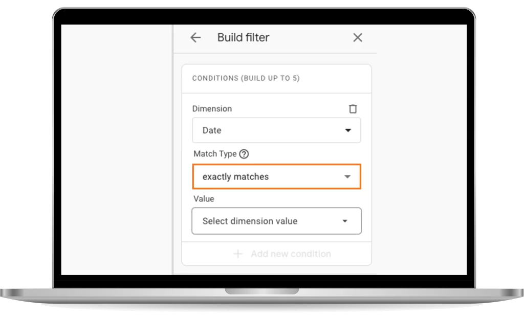 A huge new feature, match types are essentially a brand new way to filter data in any of your reports. To see this, click the ‘Add filter +’ button just under the title of a report, and you’ll see a window pop up on the right of the screen.