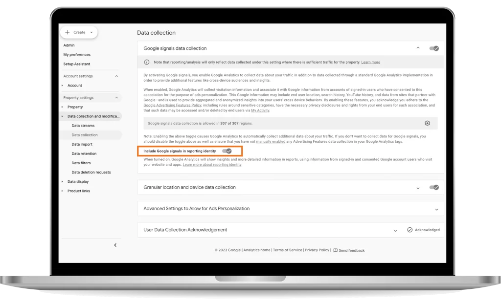 If you’re tired of hitting data thresholds because of this feature, Google has added the option to turn off Google Signals in reports, but not in the actual data collection. If that sounds appealing, you can find the option in Admin -> Data Collection in your GA4 property.