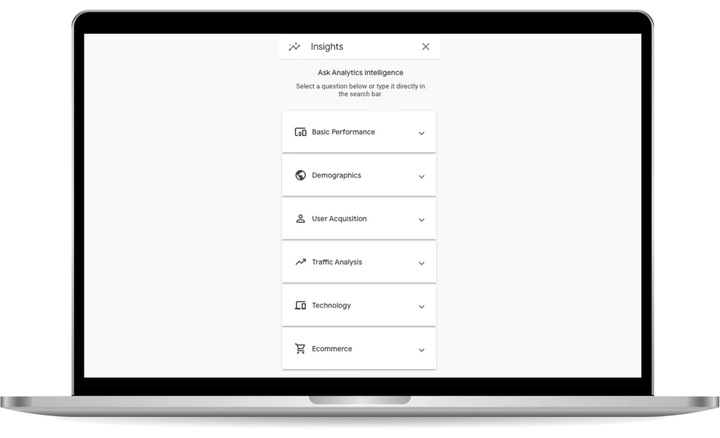 Analytics intelligence is another AI tool from Google that helps you answer quick questions about your property. It provides you with a tree of potential questions, each under its own category. To find this feature on the Home page, click the sparkling line graph icon in the top right of the page, and you will see it pop up on the right side of the screen.