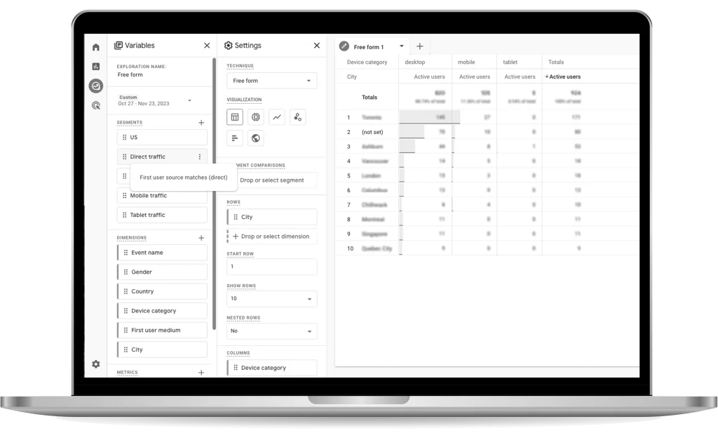 While likely the bulk of your time with GA4 will be spent in the Reports section, Explorations is a tool that’s designed to allow you to drill into your data. Essentially, you can build your own reports, with the analysis of your choice, presented in the format you desire. Google provides an easy-to-understand interface for this, and if you feel unsatisfied with the depth of analysis GA4 provides you, definitely get started with Explorations.